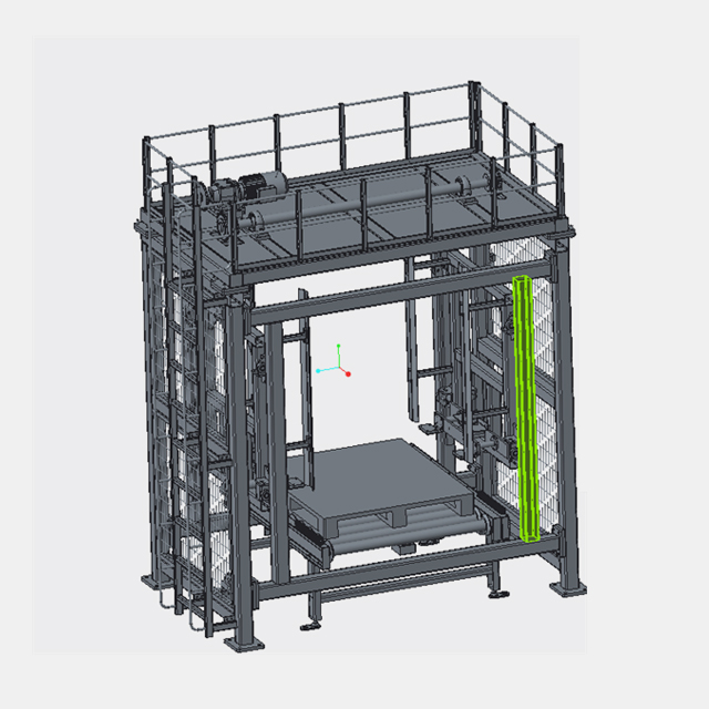 折疊盤機(jī)是用于空托盤的折疊裝置,目的是為了將空托盤堆疊起來,減少占地面積,通常用于自動化倉庫的空托盤出口處。首個托盤進(jìn)入拆/疊盤機(jī)到位后,升降臺將托盤升至最高位,兩側(cè)撥叉伸出,升降臺下降,將托盤放至撥叉上。待下一托盤進(jìn)入拆/疊盤機(jī)并定位后,升降臺將托盤連同撥叉上托盤升起一定距離(升降臺上升至中間位),兩側(cè)撥叉收回,升降臺再上升至最高位,兩側(cè)撥叉伸出,升降臺下降至最低位,將托盤放至撥叉上,完成第二個托盤的碼盤