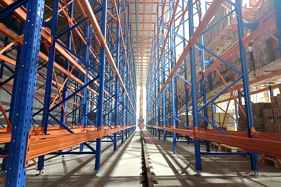 本方案總貨位1630個,長30m,寬11m,高8m。由貨架、天地軌、直式巷道堆垛機(jī)系統(tǒng)、輸送線系統(tǒng)、WMS、WCS系統(tǒng)等組成。貨架采用橫梁組合式,4個巷道9排25層;5列24層+7排2列13層,堆垛機(jī)采用雙立柱地面支承形式。提高5倍以上倉儲空間面積。